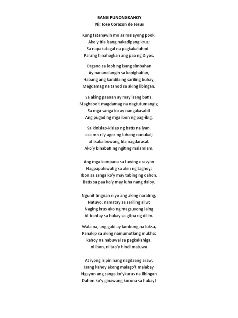 852021 Following current standards of orthography the poems title should be written as Isang Punongkahoy which can be translated as One Tree or A Tree. 2242021 Isang punong kahoy ni Jose corazon de Jesus. Beech n isang uri ng hayop.