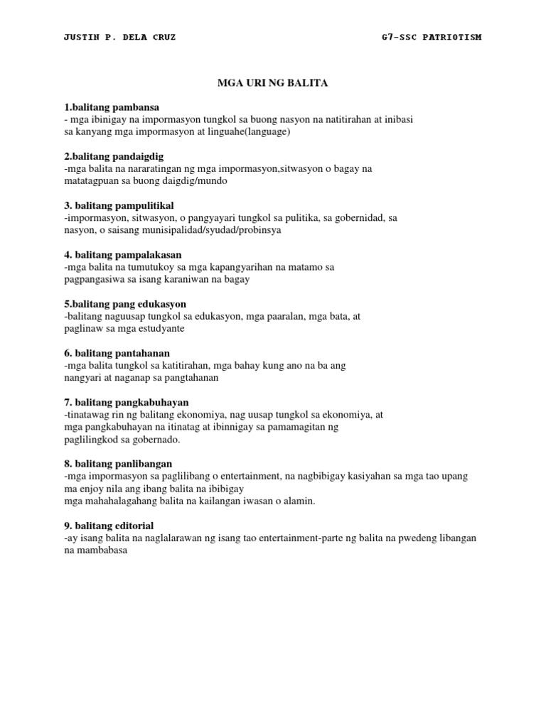 Kung ito ang tatanggapin natin na kahulugan malilimitahan ang pag-uulat ng mga kaganapan na dapat mabatid ng nakararami. URI NG BALITA BALITANG NAGBIBIGAY DIIN SA TUNAY NA NANGYAYARI 1Paunang Balita Advance News-Itinuturing na hilaw pa ang ganitong uri ng balitasubalit inilathala na rin bunga ng pangangailangang maipaabot agad sa madla. Ang mga detalye na kaugnay ng pangyayari ay.