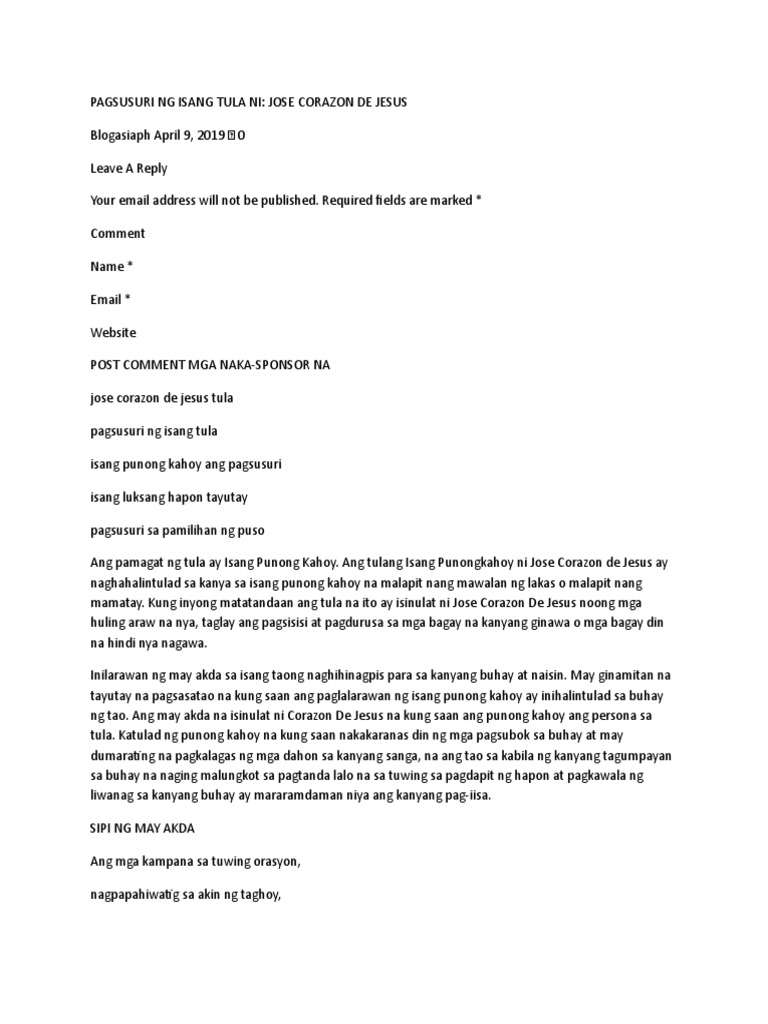 Piliin sa loob ng kahon ang titik ng iyongkasagutana. Isang Punongkahoy ni Jose Corazon de Hesus Tula Watch later. Inihalintulad ni Jose Corazon de Jesus ang kanyang sarili sa isang.